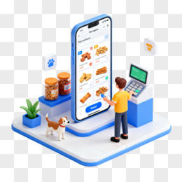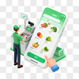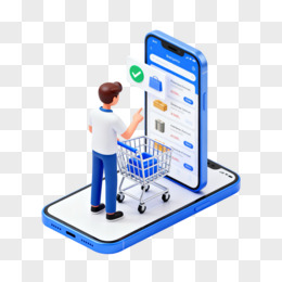 卡通手拿屏幕有绿色对勾的手机周围有购物袋购物车免抠元素