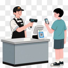 卡通收银员站在柜台后用扫码枪扫手机码免抠元素