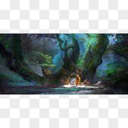 手绘插画风小女孩夜晚在森林里抓萤火虫元素