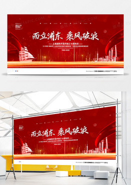 红色大气而立浦东乘风破浪浦东三十年宣传展板设计