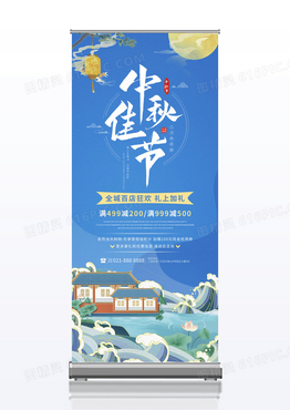 国潮蓝色中国风中秋佳节中秋节商家促销展架中秋展架