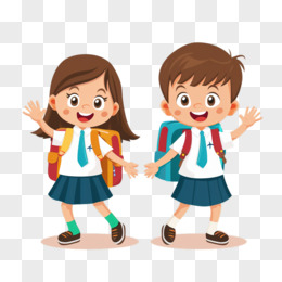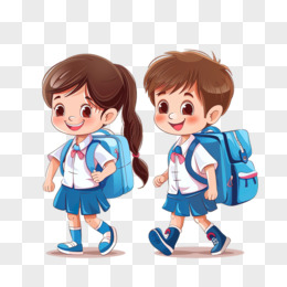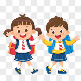 卡通走路上学的男孩女孩