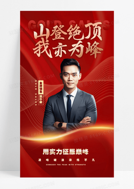 红色大气山登绝顶我亦为峰销售手机宣传海报设计
