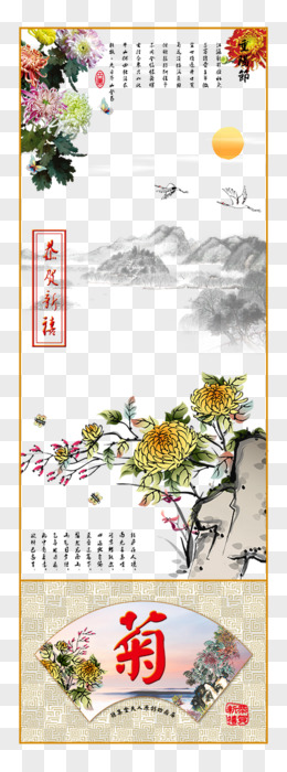手绘国潮山水卷轴插画元素