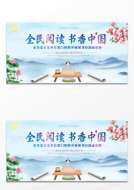 蓝色中国风水墨山水意境书香中国全民阅读日展板世界读书世界读书日