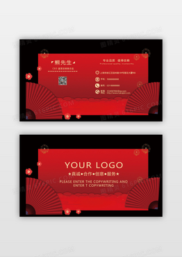 喜庆扇形卷轴红色国风名片卡券