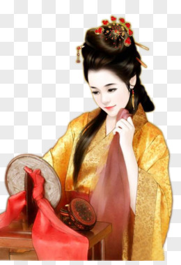 金黄色衣服女子扇子长头发免抠高清素材