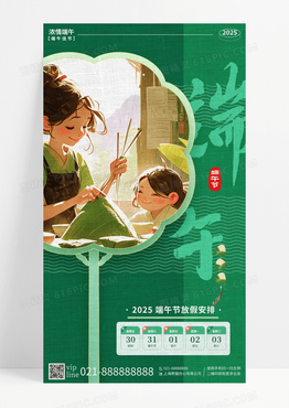绿色扇子插画2025端午节放假通知手机宣传海报