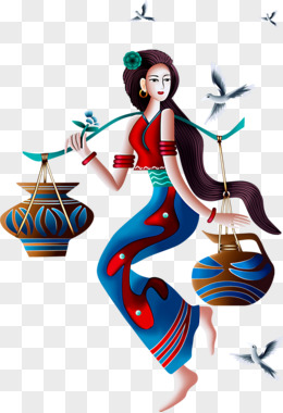 一组手绘四季系列古风人物之手拿桃花枝的少女素材