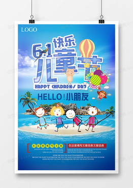 蓝色海边小人跳舞热气球海水沙滩欢乐六一儿童节海报