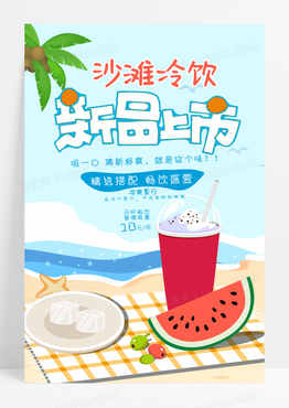 卡通简约风沙滩冷饮果饮海报