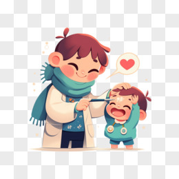 卡通妈妈拿着温度计给躺在床上的男孩测体温免抠元素