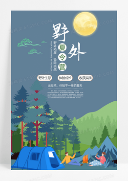 蓝色卡通野外生存探险暑期野外夏令营宣传海报