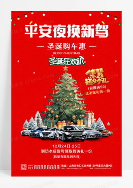 红色圣诞节圣诞树汽车广告礼物宣传海报设计