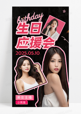 黑色涂鸦风人物女主播生日应援会手机宣传海报