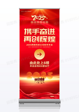 红色2025蛇年携手奋进再创辉煌科技企业年会展架易拉宝