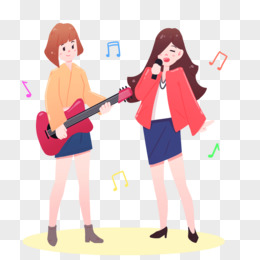 手绘女孩儿一起表演唱歌场景素材