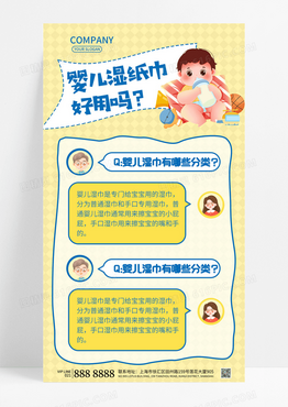 黄色可爱卡通婴儿湿纸巾育婴科普问答海报