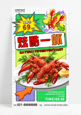 彩色方块漫画风格炫酷一虾美食手机宣传海报