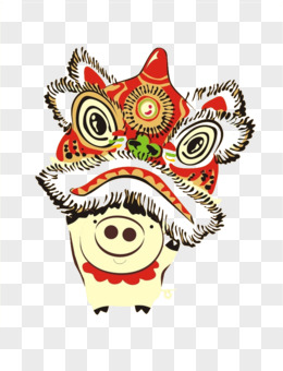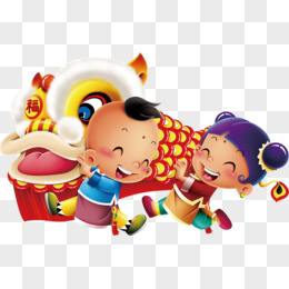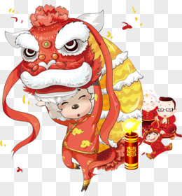 卡通手绘小女孩和舞狮子的人玩耍免抠元素