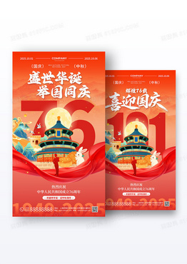 橙色手绘插画风2025盛世华诞76周年国庆中秋海报组合