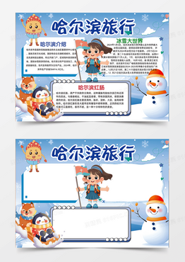 蓝色哈尔滨旅行雪人可爱卡通雪花手绘手抄报