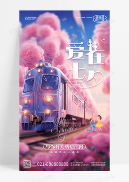 粉色玫瑰花插画爱在七夕浪漫情人节手机宣传海报