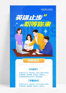 蓝色简约卡通插画英雄止步职等你来招聘手机海报长图