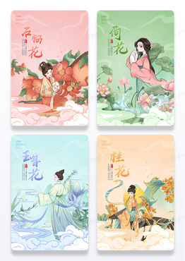 十二花神 手绘 古风美女 石榴花 荷花 玉簪花 桂花 借势海报 套图