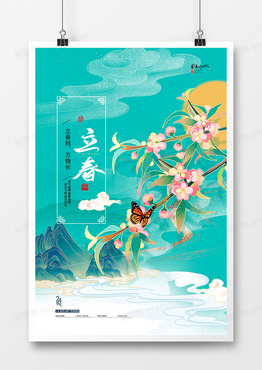 手绘国潮立秋山水仙鹤菊花枫叶元素