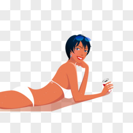 夏天之手绘卡通女孩躺在救生圈上喝饮料