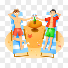 手绘卡通男生一起晒日光浴喝饮料元素