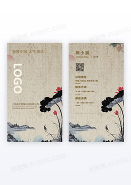 精致唯美手绘风荷花荷叶元素烫金竖版名片设计