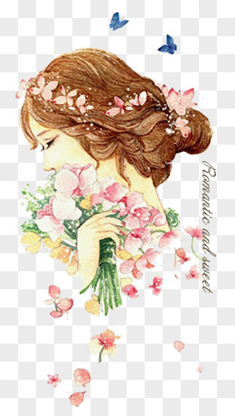 手绘卡通拿花女孩背影素材