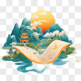 手绘茶杯山水菊花免抠创意场景免抠元素