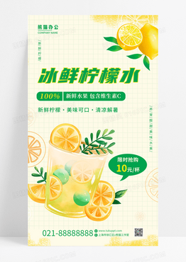 黄绿简约手绘柠檬汁UI海报柠檬水手机宣传海报柠檬手机海报