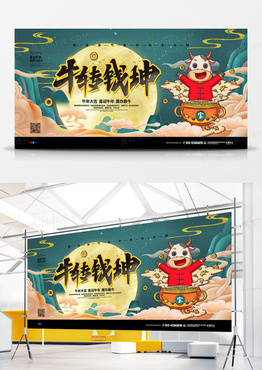 手绘国潮2021牛转钱坤牛年宣传展板设计