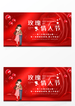 红色缤纷浪漫手绘爱心玫瑰情侣玫瑰情人节展板设计