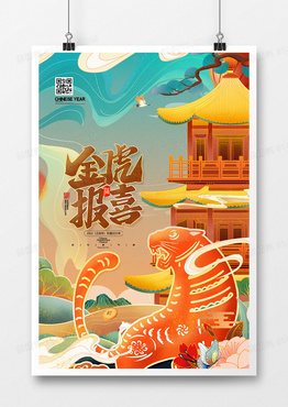 手绘中国风金虎报喜2022虎年国潮海报设计