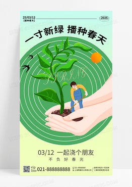 绿色清新手绘手捧树木312植树节手机宣传海报