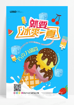 蓝色手绘卡通冰爽一夏甜筒冰淇淋海报