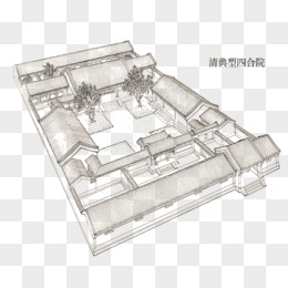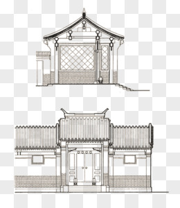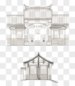 手绘国潮线条感国风亭子楼台荷花免抠元素