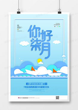 清新手绘七月你好创意海报