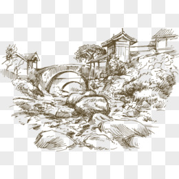 手绘日初溪水小河素材