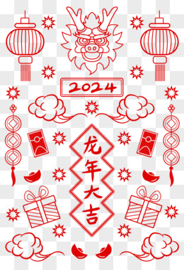 一组手绘2024春节龙年喜庆简笔画贴纸三