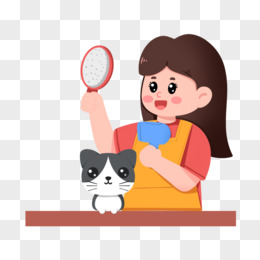卡通手绘女孩为小猫咪梳理毛发免抠元素