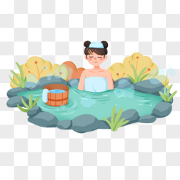 手绘卡通单人女生泡温泉免抠素材