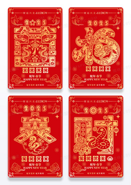 红色剪纸风2025元旦创意字体福禄寿喜新年春节组图海报