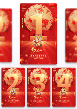 中国风红色2024龙年新年元旦倒计时手机海报组图套图