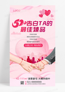 粉色爱心牵手手520地产ui手机海报520情人节地产